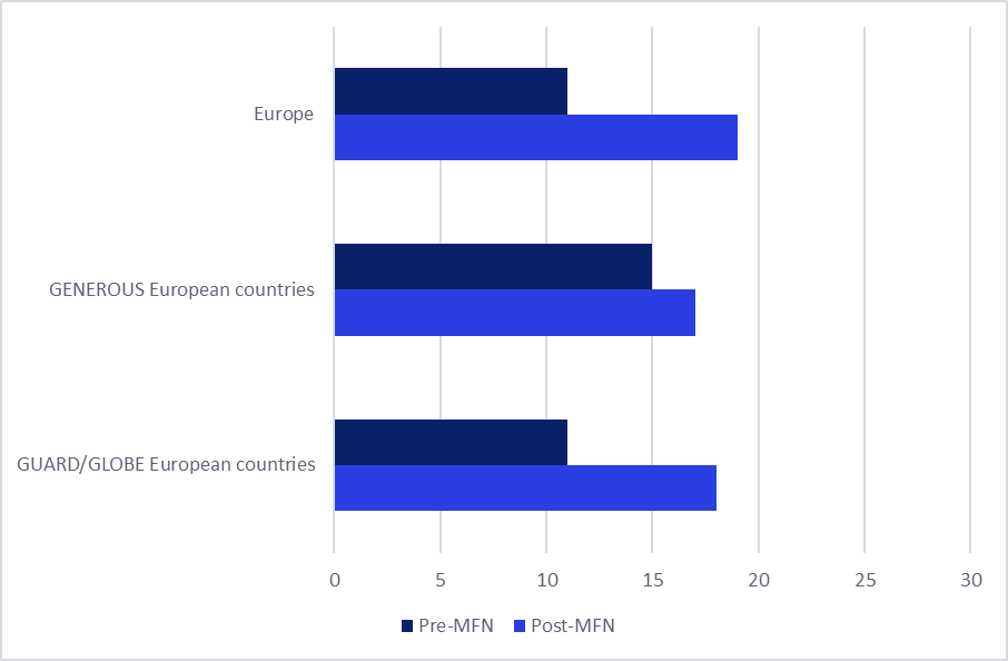 Figure 2: Average number of brand withdrawals in Europe, before and after MFN introduction