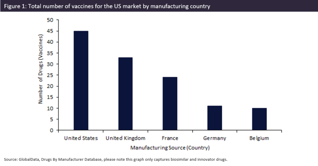 As per the figure below, the US currently reigns as the world’s leading manufacturer of FDA-approved vaccines by approximately 36%, with 45 vaccines manufactured in 32 facilities nationwide. According to GlobalData’s Drug By Manufacturer database, among the countries that manufacture vaccines for the US market, the average country supplies eight vaccines. By comparison, US-based production is just over five times that average, highlighting how concentrated the US’s domestic supply is and the heavy reliance US vaccine manufacturers have on the constant and predictable domestic immunisation demand.